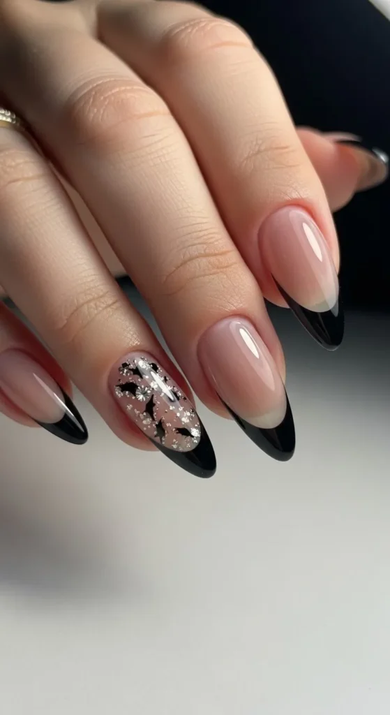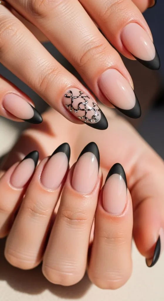 This design keeps your black tips thin and neat while adding sparkle on one or two nails. Paint all nails with nude polish first. Add slim black tips. Then choose an accent nail and apply glitter polish. Use a sponge or light brush strokes to avoid thick layers. Finish with top coat. This style is great for parties and weddings. You only need one glitter polish to upgrade your look. It keeps things stylish without feeling heavy. It’s perfect if you enjoy small details that stand out.