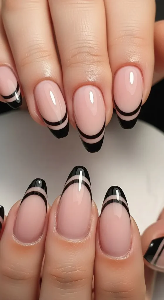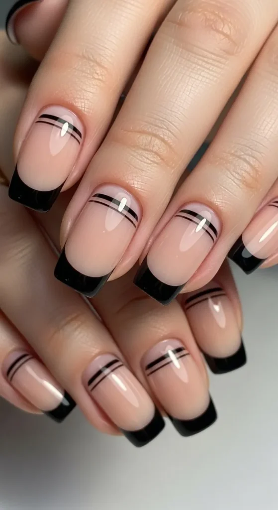 After painting black tips, draw one thin line above them using a nail pen. Keep lines straight and even. This adds a modern artistic feel. It works best on medium nails. Finish with top coat. This style looks clean and professional. It’s great if you like simple designs with a creative touch.
