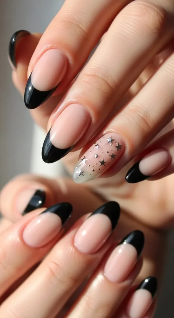 Paint black tips and add small star shapes using white or silver polish. You can use stickers if drawing feels hard. Keep stars on one or two nails. Seal with top coat. This style feels fun and youthful. It’s perfect for casual wear. Stickers are cheap and save time.
