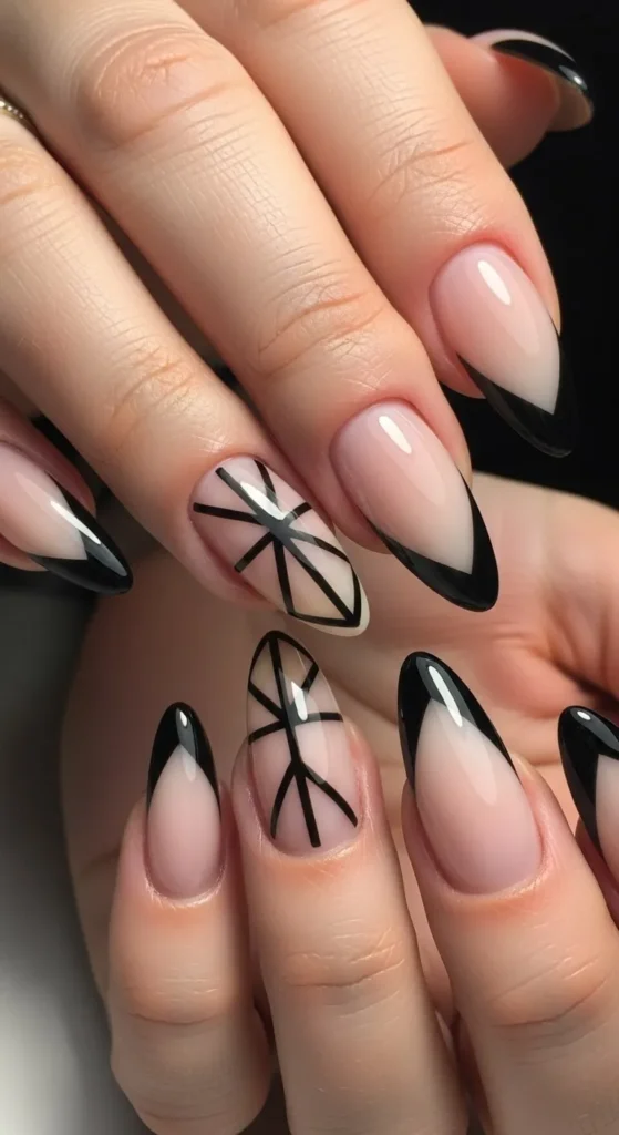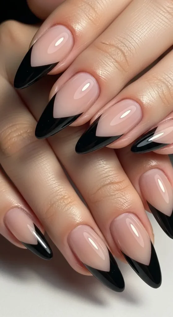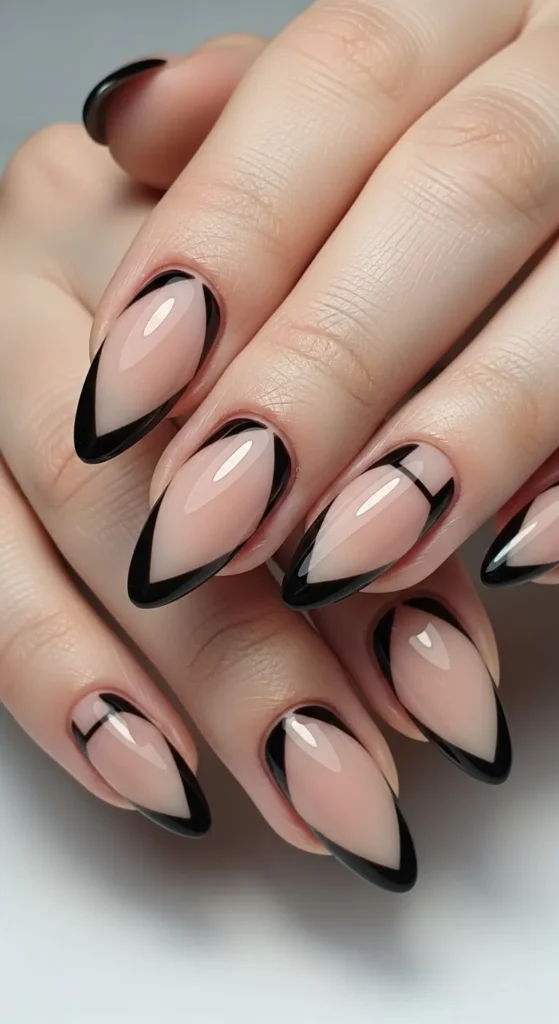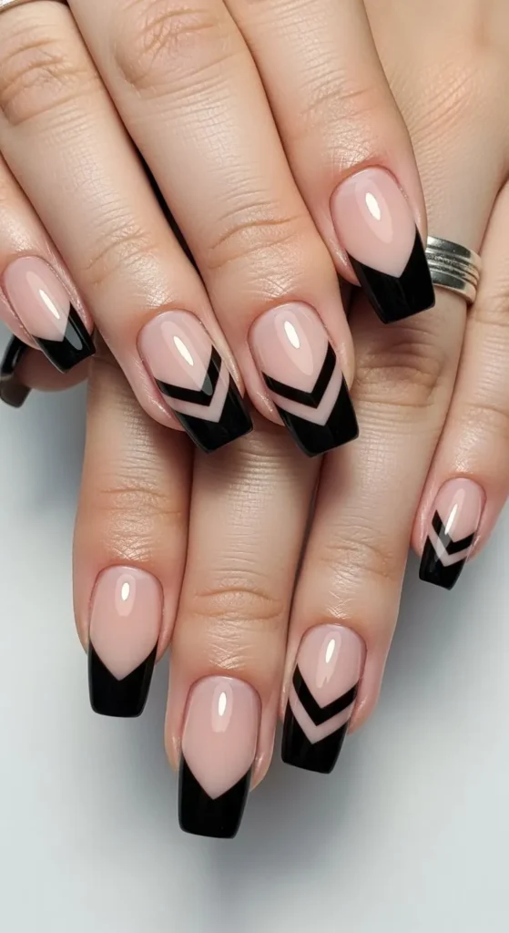 Instead of straight tips, paint triangles pointing inward. Use tape for clean lines. Apply nude base, then form triangles with black polish. Remove tape carefully. Finish with top coat. This geometric style looks bold and creative. It suits modern outfits and sharp nail shapes. It’s simple but makes your manicure feel special.