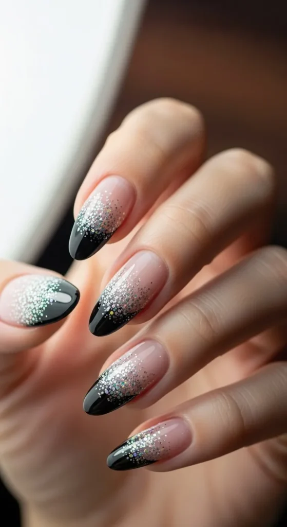 After black tips, dab fine glitter upward using a sponge. Keep the glitter light. Seal with top coat. This adds soft shine. It’s great for parties and dinners. One glitter polish can last for many designs. It keeps nails stylish without being loud.