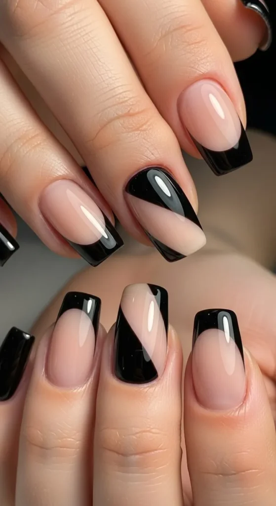 Reverse French tips place the black line near the cuticle instead of the nail edge. Start with nude polish. After drying, paint a curved black line near the base. Nail guides make this easier. This style feels modern and different from traditional French tips. It works well on short nails too. Seal with clear top coat. It gives a bold look without extra designs. If you want something unique but still simple, this is a great option.