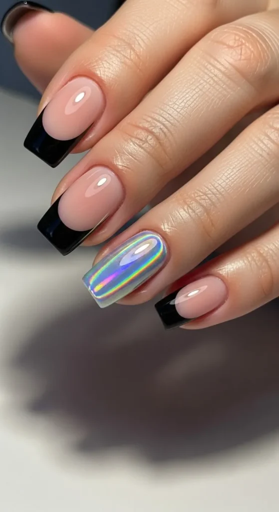 Paint most nails with black tips. Use holographic polish on one or two nails. Seal with top coat. This adds rainbow shine. It looks amazing in sunlight. Holographic polish is affordable and long-lasting.