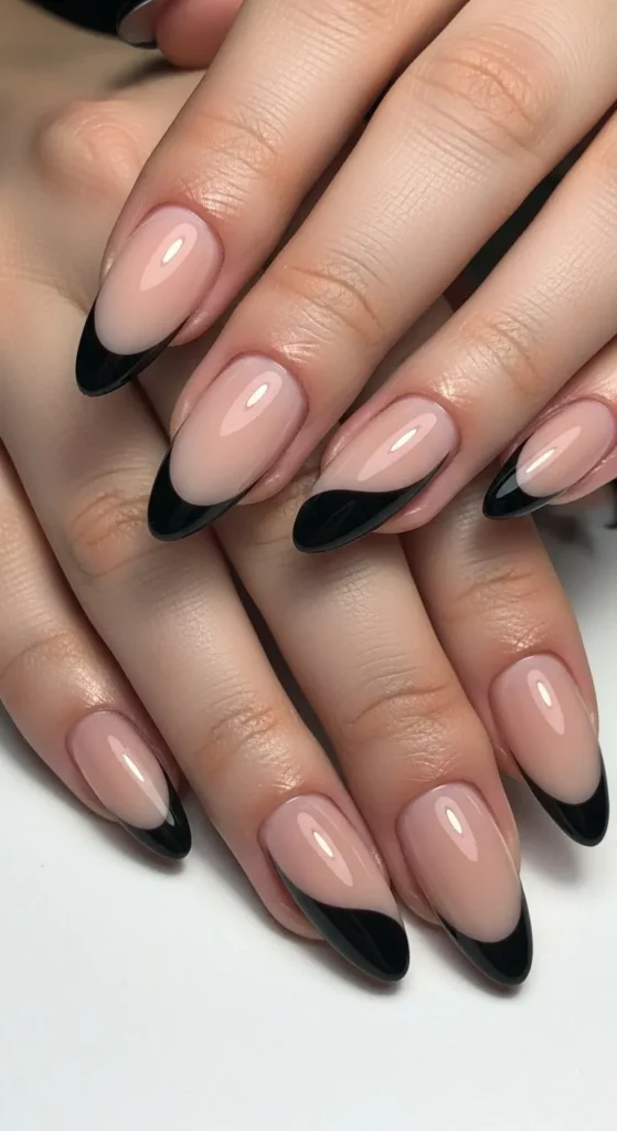 Ombre tips fade from nude to black smoothly. Apply nude polish first. Then use a sponge with black polish to dab near the tips. Blend gently. Repeat until smooth. Seal with glossy top coat. This design makes nails look longer. It’s stylish and works for all nail shapes. You only need one sponge and two polishes. It’s a great way to practice blending at home.