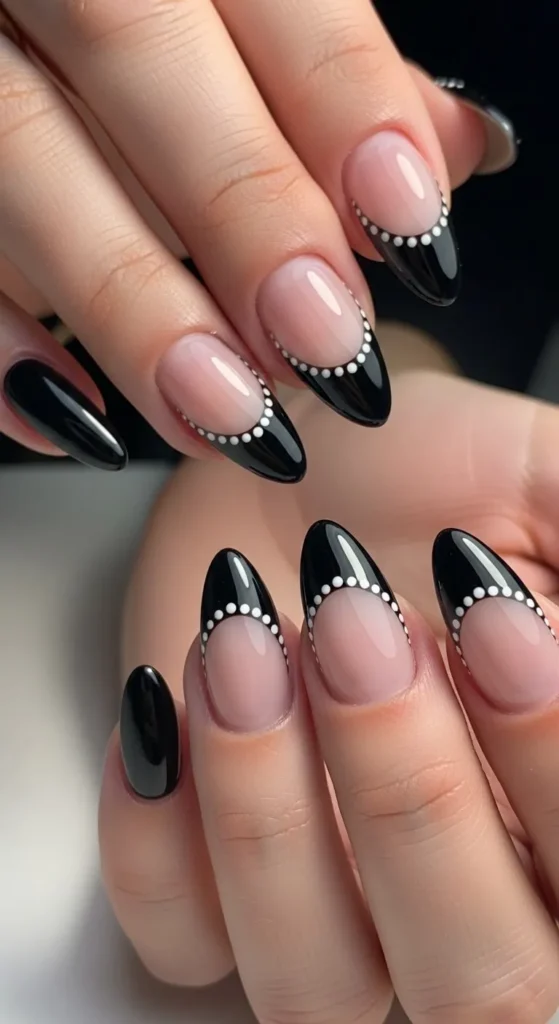 This design mixes classic black tips with cute white dots. Paint nude base and black tips first. After drying, use a toothpick to add small white dots along the tip line. Keep spacing even. Finish with top coat. This style feels playful yet neat. It’s budget-friendly and easy for beginners. You can change dot size to match your mood. It’s ideal for casual days and light outfits.