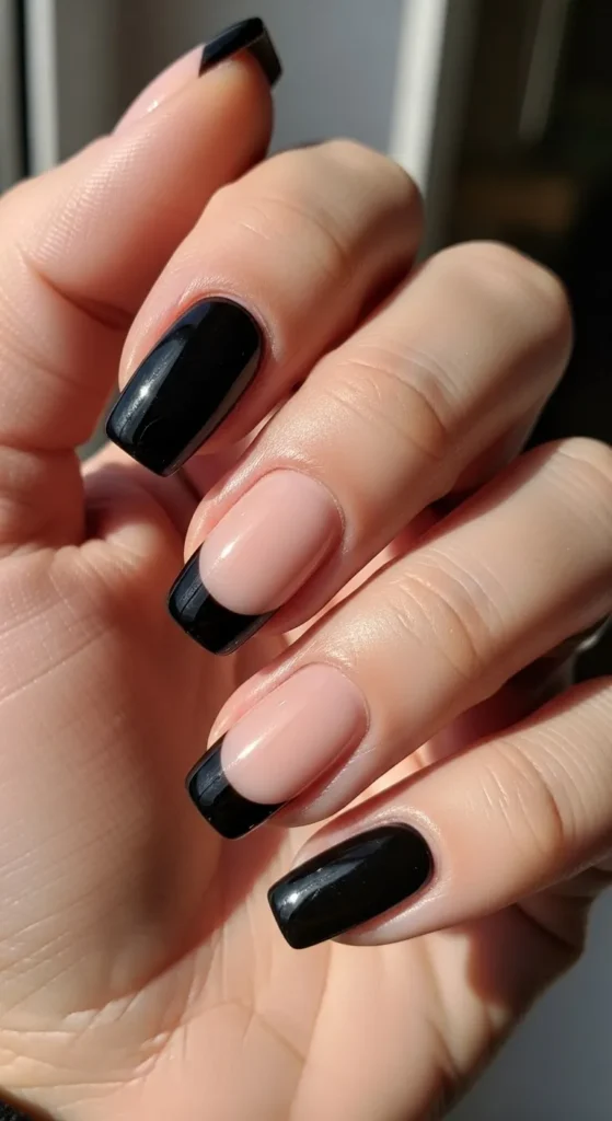 Matte black tips give your nails a soft, modern appearance. Instead of shine, you get a smooth, velvety texture that feels trendy. Apply nude polish first. Paint black tips and let them dry. Then use a matte top coat only on the tips. This creates contrast with the glossy base. Matte polish is affordable and lasts well when sealed properly. This style suits everyday wear and looks great with neutral outfits. It’s a simple way to change your look without adding decorations. If you like low-maintenance nails, this option works beautifully.
