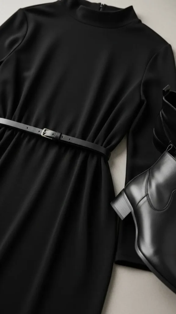 High-neck dresses feel sleek and classy. Adding a skinny belt helps define your waist cheaply, and you can DIY one from old belts or ribbons. Finish with ankle boots for a modern yet timeless vibe.
