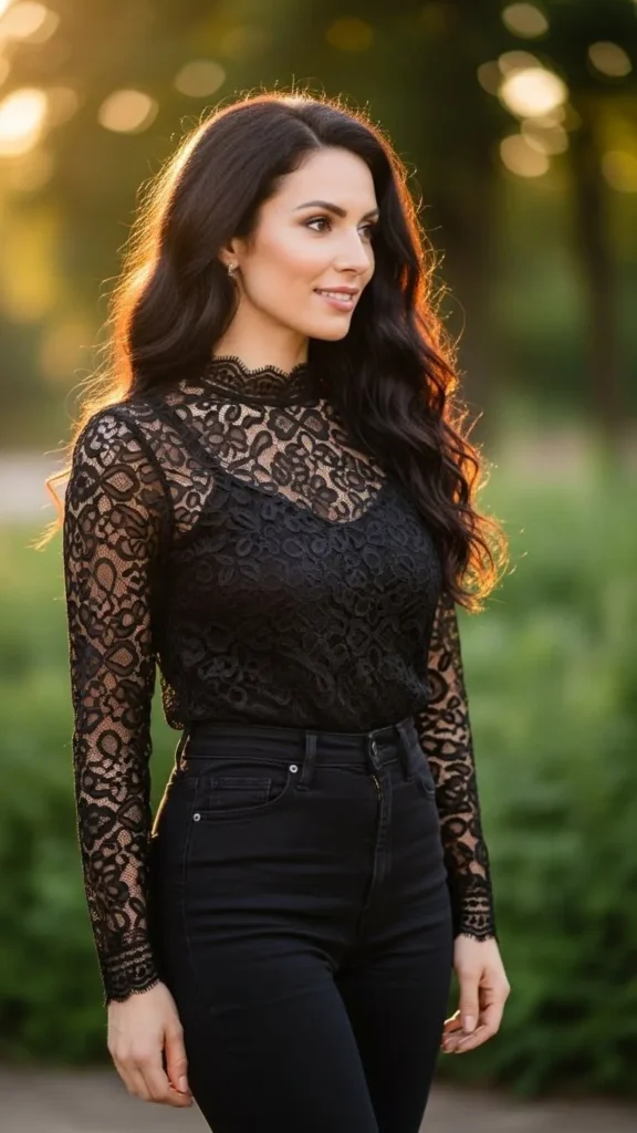 Black lace makes any look feel romantic. Pair it with high-waisted jeans for a casual yet refined vibe. Look for sales or thrift shops for lace tops. If you can’t find one, add lace trim to a plain black top—simple sewing or strong fabric glue works perfectly.
