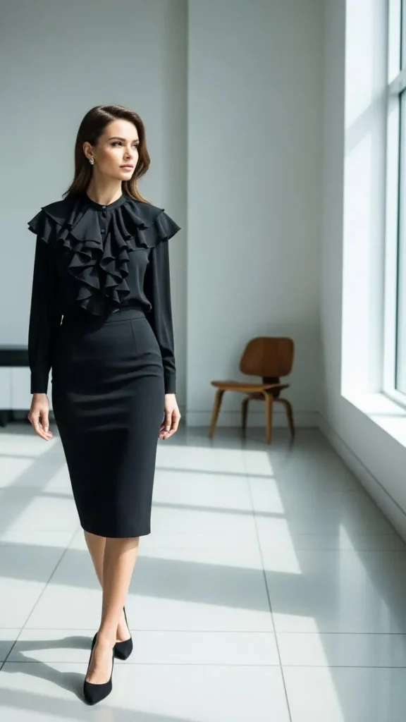 Ruffles add femininity with very little effort. You can even DIY by sewing some fabric strips onto the shoulders or neckline of a blouse. Pair with a pencil skirt—often the most versatile piece in your closet for a refined yet fun Valentine’s look.