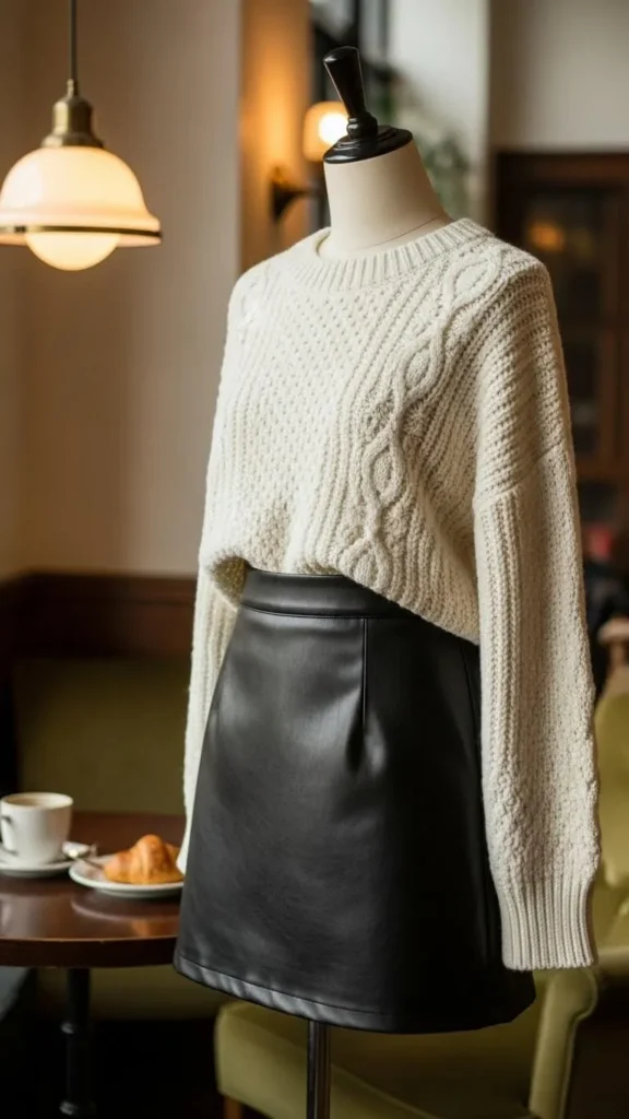 You can balance textures by pairing a shiny leather skirt with a soft knit. This combo looks chic but is very wearable for colder Valentine evenings. Look for affordable faux leather options and cozy knits, or repurpose older pieces in your wardrobe.