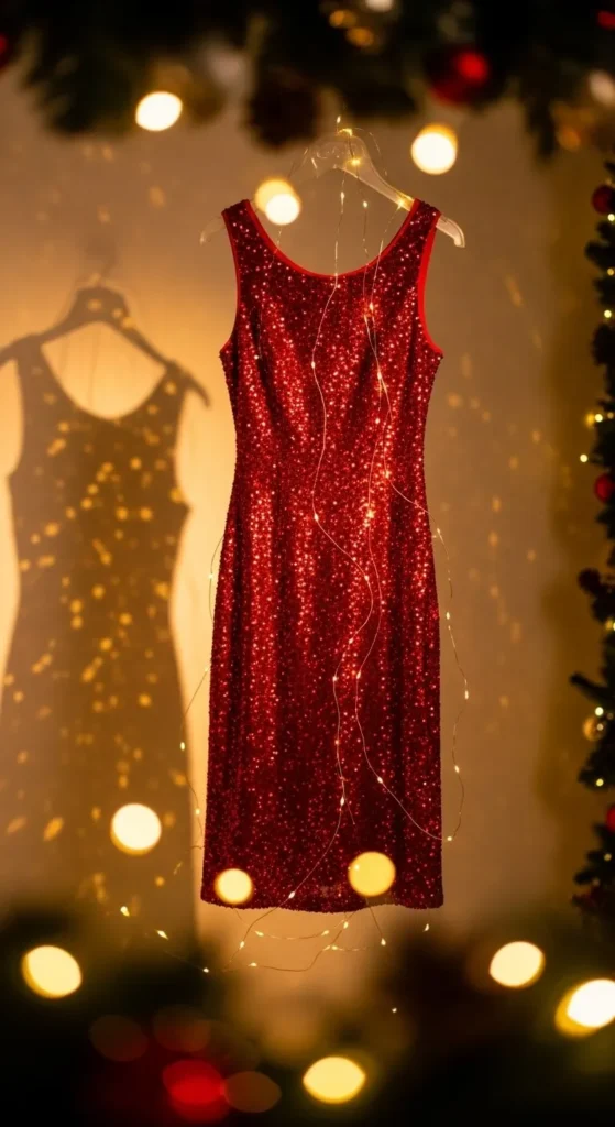 A red sequin midi always feels right for Christmas gatherings. It glows under indoor lighting and photographs beautifully. You can keep the rest simple. A pair of nude heels or black pumps works well. Skip pricey accessories and use what you already own. A small clutch and gold studs create a clean finish. If the dress feels a little loud, add a matte shawl in black or cream.