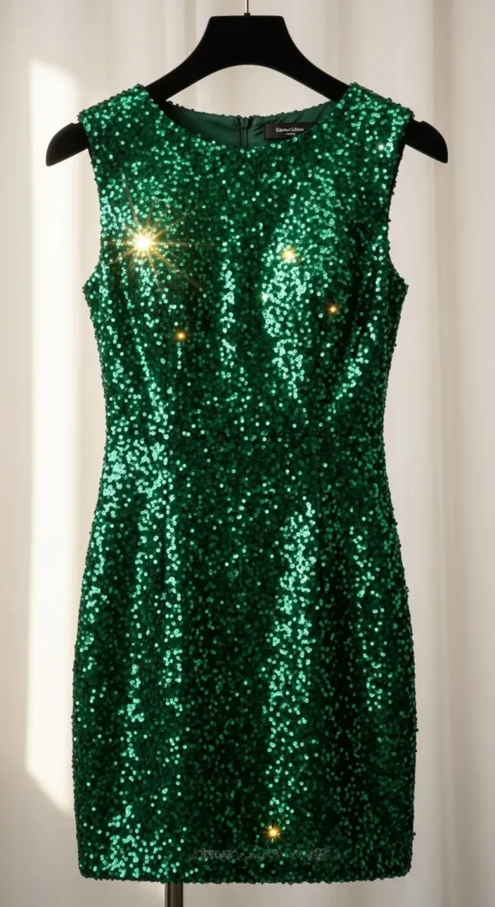 Emerald green sequins scream holiday cheer. Mini dresses are playful and easy to style. Keep accessories minimal—small gold hoops or a thin bracelet is enough. Nude heels lengthen the legs without stealing focus. If your dress is plain at the back, add a small bow or rhinestone clip. Loose waves work well with this look, giving soft motion. Sequins shine on their own, so skip necklaces unless very delicate. A simple clutch keeps the outfit functional. For budget-friendly sparkle, add a glitter belt or DIY rhinestone sash. This dress works for friends’ parties or office gatherings where you want to feel festive but not overdone.