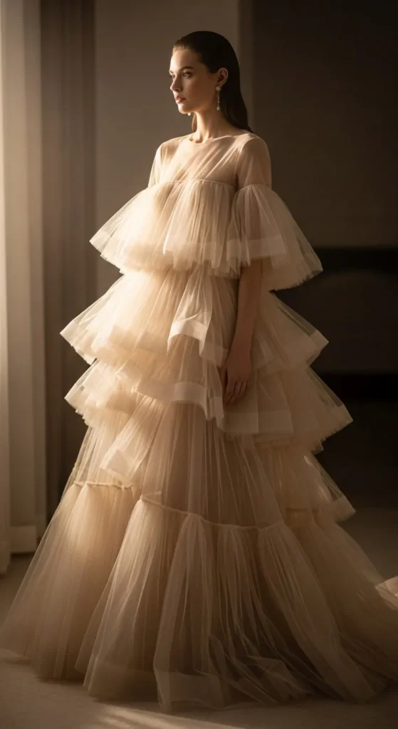 A tulle layered dress gives a fairy-like holiday vibe. Champagne shades reflect light softly. Pair with nude or gold sandals. Keep jewelry simple—tiny studs or thin rings work well. To DIY, add a thin ribbon belt or small rhinestones along the waistline. Tulle adds volume, so a fitted top balances it out. Soft curls or a low bun works best with this silhouette. Perfect for formal gatherings or indoor celebrations.