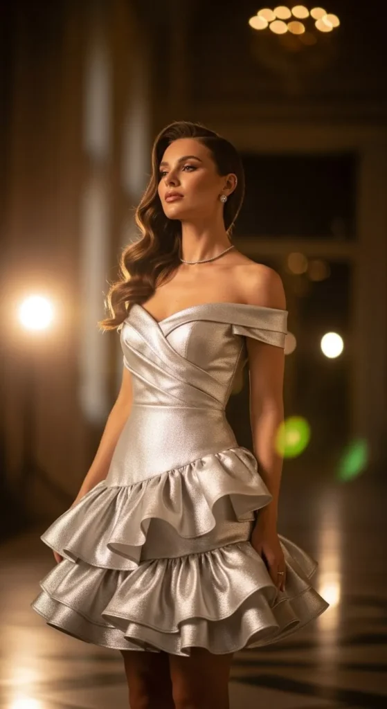 Ruffles add a festive flair without overcomplicating the outfit. The silver fabric captures holiday lights beautifully. Pair with neutral heels or silver sandals. Small stud earrings or a delicate bracelet completes the look. For a DIY touch, attach tiny rhinestones along the ruffles. Loose waves or a low ponytail balances the off-shoulder neckline. Ideal for cocktail parties or office celebrations where you want sparkle without fuss.