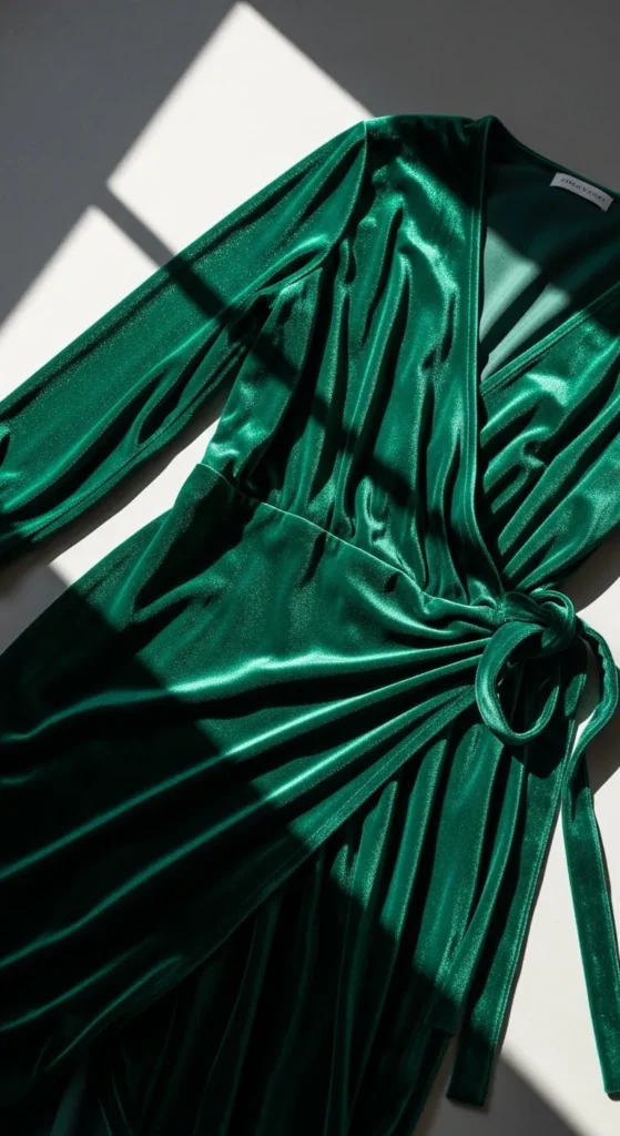 An emerald wrap dress looks warm and elegant during the holidays. Velvet reflects light gently, so even simple silhouettes feel special. Wrap styles are comfortable, adjustable, and flattering for most body shapes. You don’t need expensive jewelry here. Choose small gold hoops or a dainty necklace. For a budget-friendly touch, use a safety pin behind the wrap to prevent shifting.