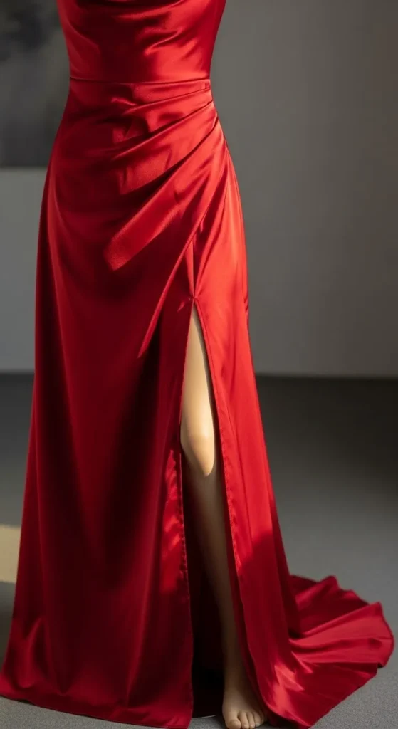 A side slit adds elegance and movement. Satin keeps it soft and festive. Pair with black or nude heels. Minimal jewelry works best—small studs or thin rings. For a DIY touch, attach a small metallic brooch to the waist. Loose curls or a sleek ponytail complete the outfit. Works for formal dinners, holiday parties, or New Year’s events.