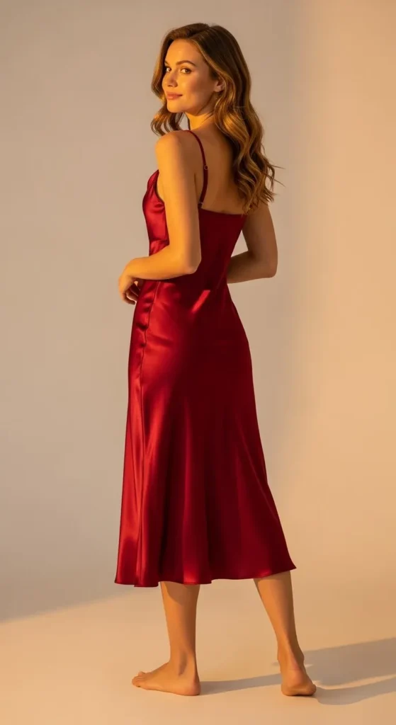 Burgundy slip dresses are effortless yet chic. Satin reflects light beautifully. Pair with black or nude heels. Minimal jewelry keeps the outfit clean. DIY options: add a thin ribbon belt or small crystal applique. Loose hair with soft waves works best. Great for small dinners, office parties, and evening gatherings. Easy, practical, and festive.