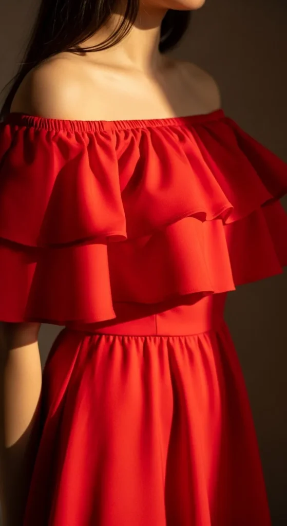 Ruffles add playful movement to an off-shoulder silhouette. Red keeps it festive. Pair with nude or black heels. Minimal jewelry works best. DIY tip: add a small bow or crystal applique on the waist. Loose waves or a half-up hairstyle balances the neckline. Perfect for holiday dinners or casual parties.