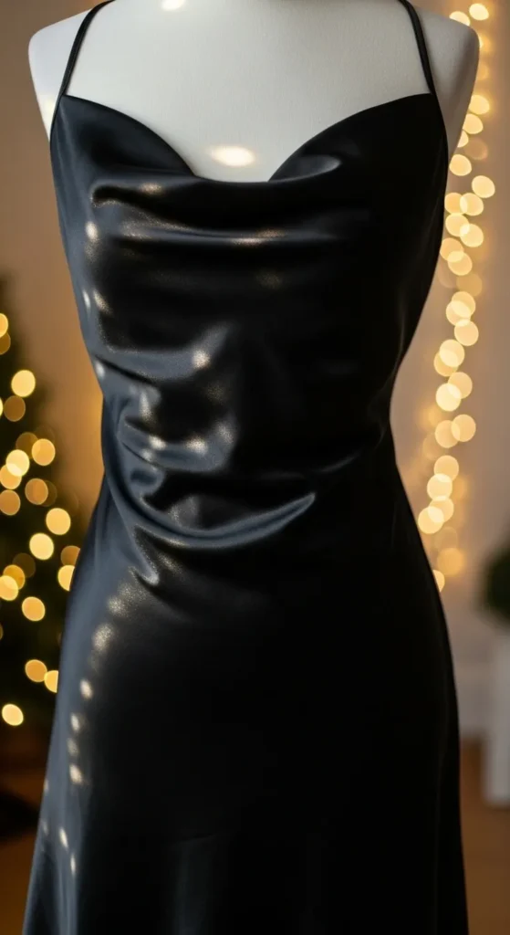 Black satin slip dresses feel sleek and elegant. Cowl necks create a soft drape, flattering most body types. Pair with metallic or black heels. Keep accessories minimal—a thin bracelet or studs works well. DIY: add a small rhinestone brooch at the shoulder or waist for charm. Soft curls or a sleek ponytail complete the look. Great for intimate gatherings, holiday dinners, or New Year parties. Simple yet festive.