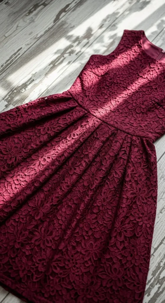 A burgundy lace dress feels romantic and holiday-ready. The fit-and-flare shape flatters most figures and moves comfortably. Lace adds detail without needing bold jewelry. Choose light makeup and maybe a soft berry lip. If you want to customize, add a satin bow at the back or waist. You can make one at home using wide ribbon. Neutral heels or black pumps pair well. A simple clutch completes the look. If the lace feels scratchy, wear a slip underneath. This also helps the skirt hold its shape. A half-up hairstyle suits lace dresses nicely, keeping the neckline visible. This dress works well for family photos and church events too.