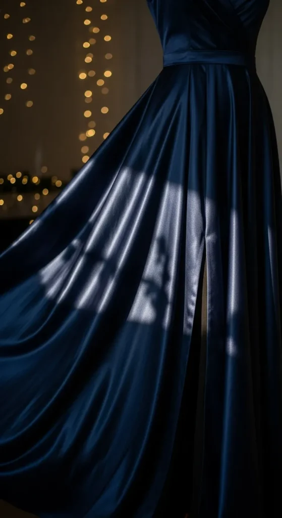 A navy satin gown gives a smooth and elegant look. The high slit adds movement without being too bold. Satin reflects soft light, making the dress look more expensive than it is. If you want more shape, add a thin metallic belt. Shoes in silver or navy blend well. You can add sparkle by sticking small rhinestones onto the shoulder straps. This is an easy DIY idea that upgrades the outfit instantly. Keep makeup simple with winged liner and a nude lip. A sleek ponytail works best with this silhouette. Carry a clutch in silver or navy. If the slit feels high, you can sew a small stitch to adjust it. This gown works great for formal Christmas galas or winter weddings.