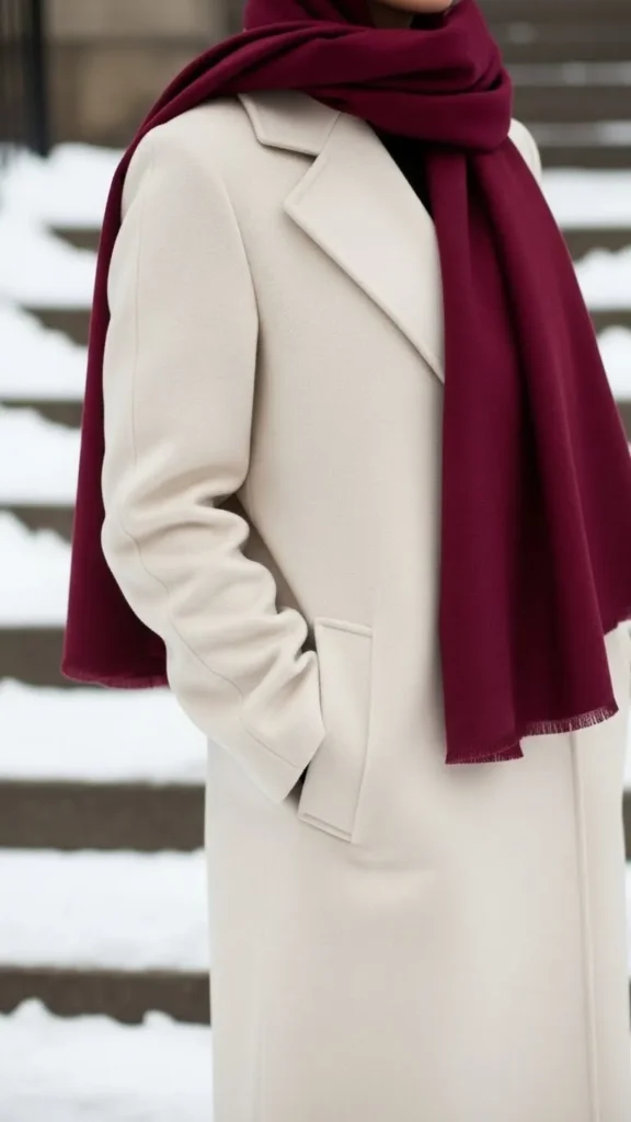 Cream and burgundy feel warm and cozy together. A long coat adds structure while the scarf adds color. Wear with trousers or jeans. For budget styling, pair a long cardigan with a thermal tee and add a thick burgundy scarf to recreate the look. Add ankle boots and soft curls for the hair. This outfit works well for dinner nights or Christmas gatherings.