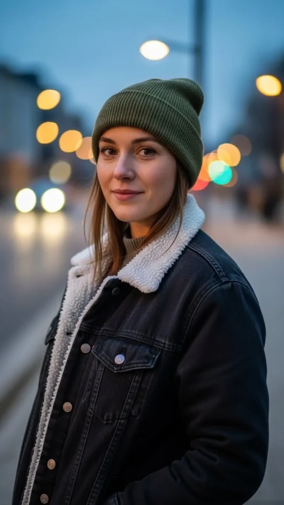 12. Black Sherpa-Lined Denim Jacket With Green Beanie