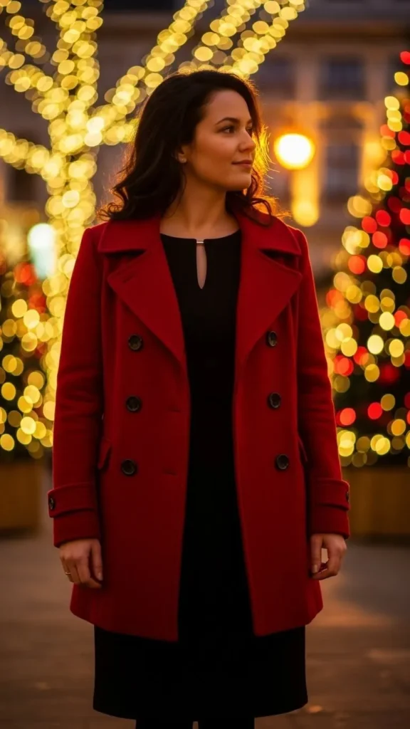 A red peacoat looks festive without extra effort. Layer it over a black dress for a clean, easy night-out look. Add tights and ankle boots. You can also layer a long-sleeve top under the dress for warmth. Budget-friendly swap: try a red cardigan over a black base outfit. Add a small bag and minimal jewelry.