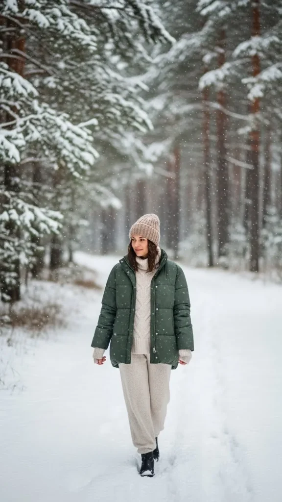 A green puffer feels seasonal and pairs well with cream. Wear a matching knit top and pants for a cozy combo. Add white sneakers or tan boots. If you don’t want to spend much, use a green hoodie instead of a puffer and still pair it with cream pieces. Add a warm scarf for extra comfort.