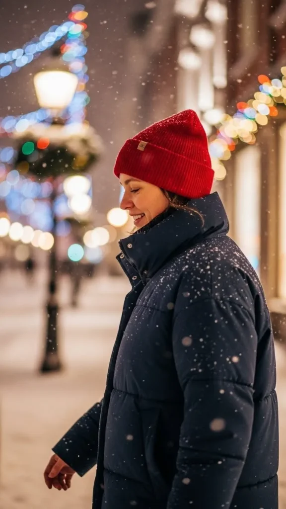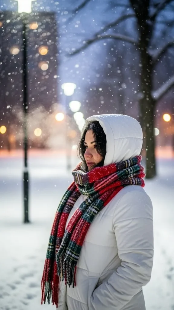 A white puffer looks bright against winter nights. Add a plaid scarf for Christmas color. Pair with jeans or leggings. Add boots and a small crossbody bag. If you want a cheaper version, try a white fleece with a scarf. This look feels warm and friendly.