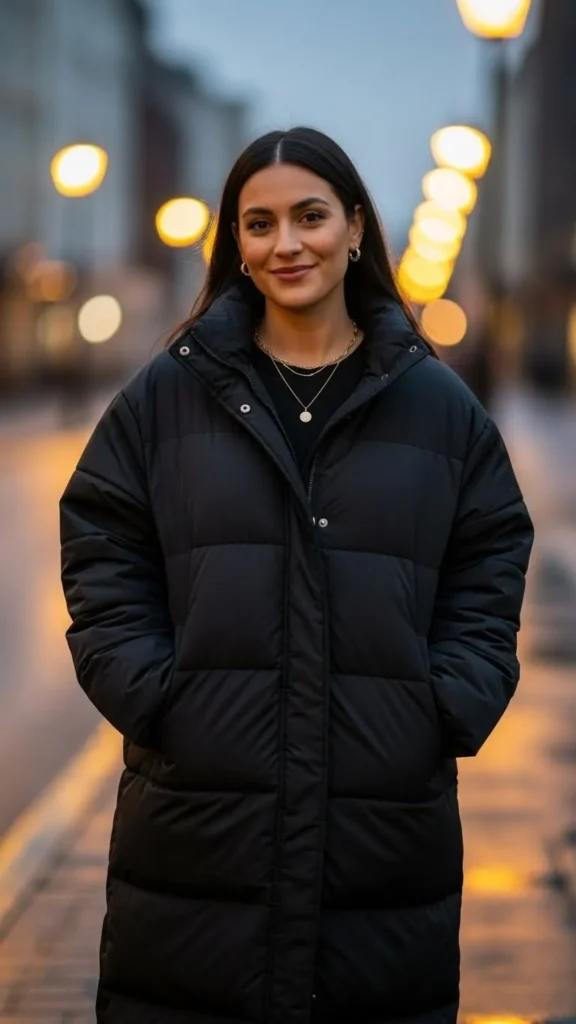 A long puffer keeps you warm while staying sleek. Add small gold jewelry and a gold-toned bag for soft shine. Wear with leggings or straight pants. Budget trick: layer a thin puffer vest inside a cheaper long coat for warmth.