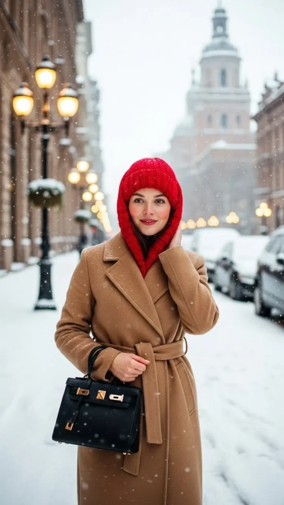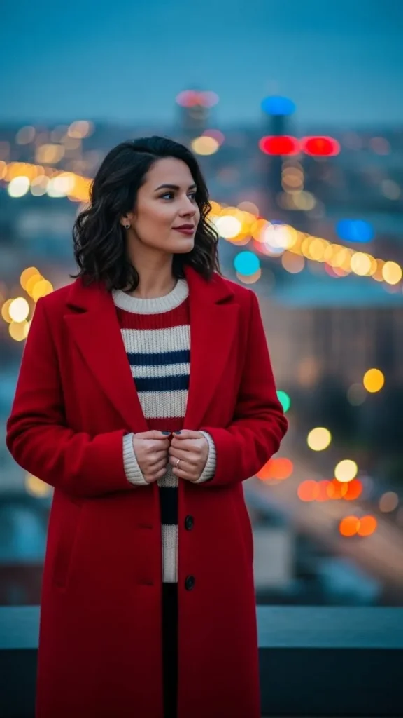 A red wool coat always feels festive. Layer it with a striped sweater for a simple yet cheerful combination. Wear straight jeans or wide-leg trousers. Add ankle boots or loafers depending on comfort. If you want to save money, try a red trench or long cardigan paired with a thermal layer for warmth. Add a tote or small structured bag. A striped sweater helps keep the outfit playful. Keep hair natural and add soft makeup for a warm holiday glow.