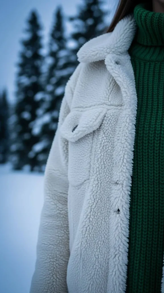 A white sherpa jacket brings instant coziness. It pairs well with a deep green sweater for a classic Christmas color combo. Keep the rest simple with black leggings or straight trousers. Add white sneakers or ankle boots to balance the textures. If you don’t want to spend much, try layering a thin fleece under a lighter sherpa to mimic a thicker version. You can also add a green beanie for extra color. This outfit works for shopping days, casual gatherings, or quick coffee runs. The sherpa adds warmth while the green sweater brings seasonal charm. Keep jewelry minimal and soft—think pearl studs or a tiny gold charm necklace. Everything feels comfortable, breathable, and perfect for chilled evenings.