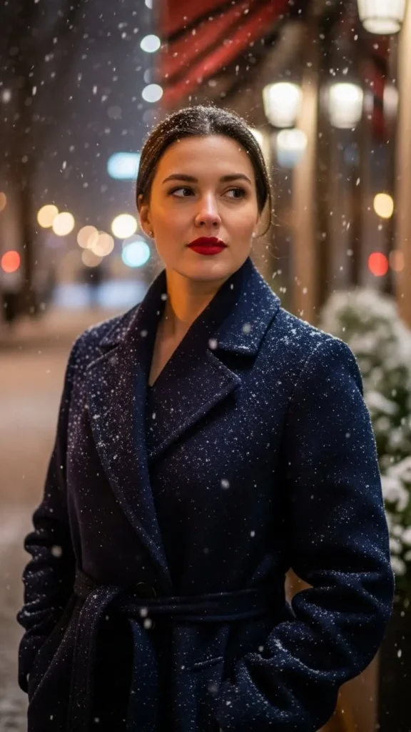A navy coat feels classic and calm. A red lip adds a small holiday touch without needing extra pieces. Pair with trousers or dresses. Add a small purse. This is a simple but polished Christmas outfit idea.
