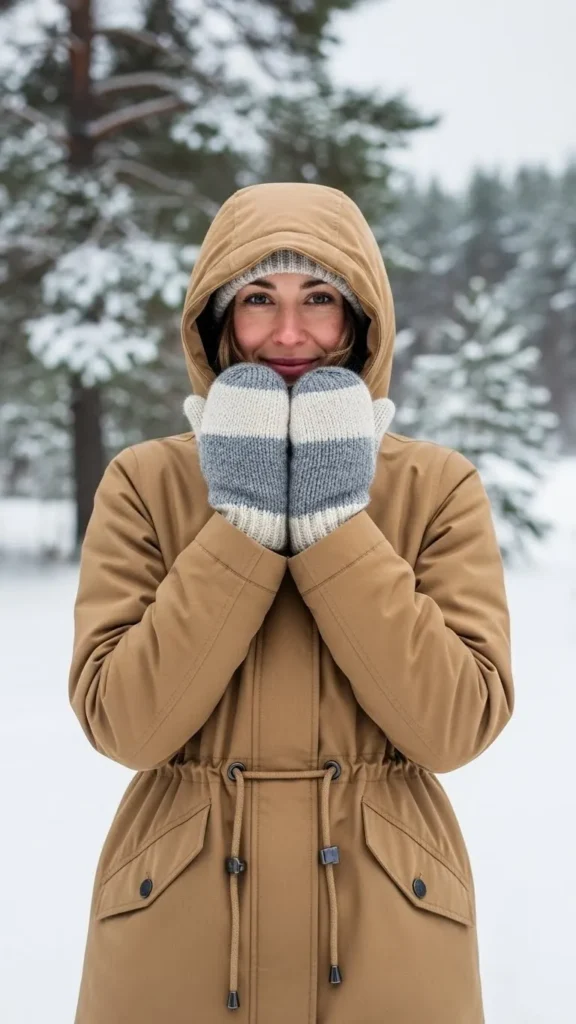 A tan parka is perfect for extremely cold nights. Layer it over a thick knit sweater and jeans for a casual holiday look. Add knit mittens and a matching beanie for warmth. Budget-friendly tip: try a beige puffer with hand-knit mittens or scarves for the same cozy effect. Pair with waterproof boots for outdoor walks or market trips. This outfit combines comfort, warmth, and a neutral winter palette that works for multiple occasions.
