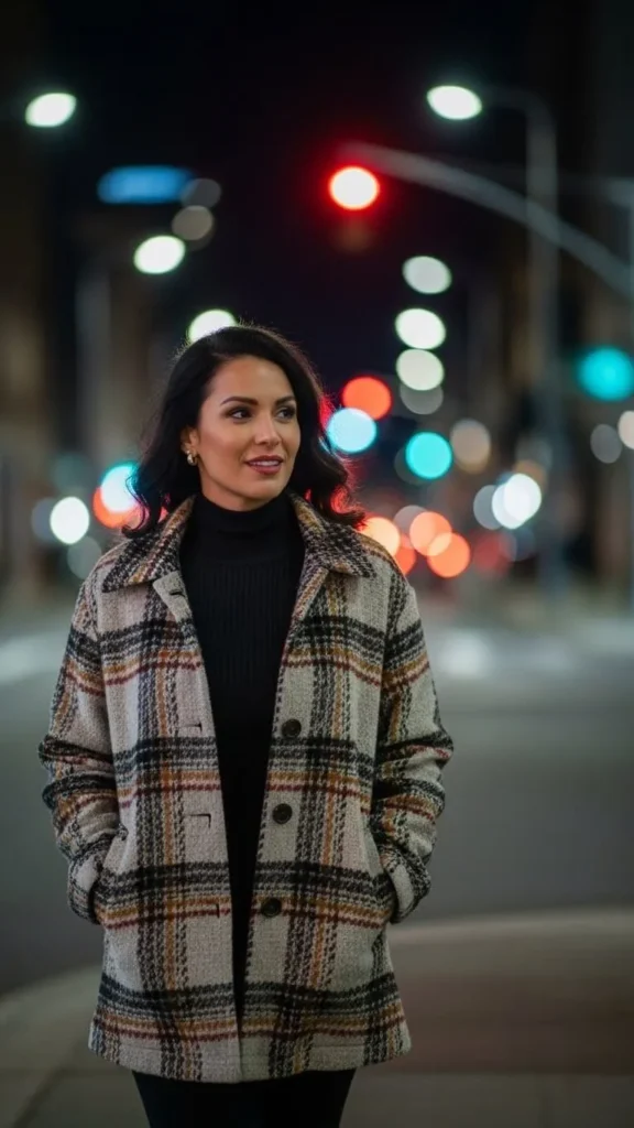 A plaid wool jacket always fits winter nights. Pick a pattern with hints of red or green to match the season. Wear it with a black turtleneck for a clean base that keeps you warm. Add dark denim or a faux leather skirt with tights. If you want a more affordable version, try a brushed flannel shacket layered over the turtleneck. It gives a similar look without the cost of wool. You can also belt the jacket for shape. Add ankle boots and a small shoulder bag to finish. The pattern does most of the work, so keep accessories light. This look works well for casual dinners, office parties, and outdoor markets where you want warmth that still feels polished.