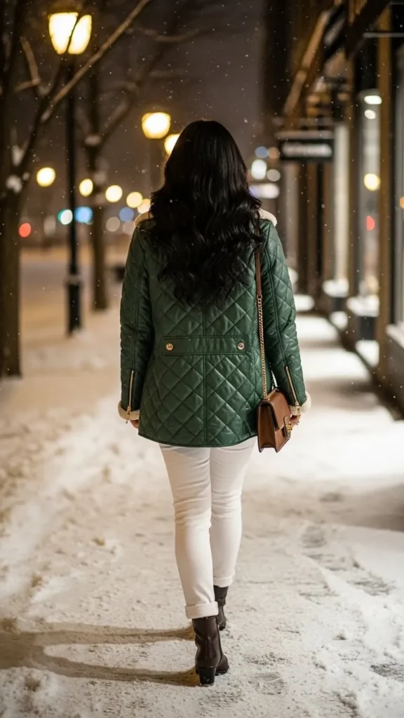 A green quilted jacket feels seasonal and bright. Pairing it with white jeans gives a clean winter look. Wear a beige or tan sweater inside for softness. Choose tan boots or white sneakers depending on the weather. If you want a budget option, try a quilted vest layered over a thick hoodie. It gives similar texture and warmth. Add a chunky beanie in cream to balance the colors. This outfit works for holiday brunch, outdoor strolls, or quick errands. The quilted texture looks winter-ready, and white jeans help it feel crisp rather than heavy. Simple gold hoops or rings keep the look neat without adding clutter.