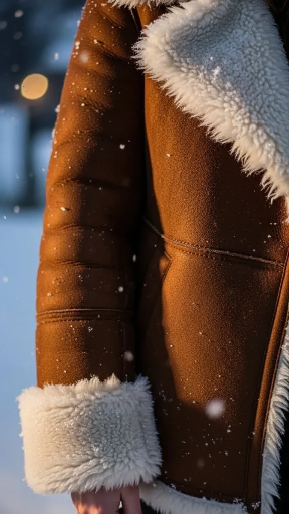 A suede-look jacket with fur lining brings warmth and texture. Pair it with white jeans or cream trousers for a soft winter palette. Add a beige sweater or fitted top. If suede is too expensive, choose a faux-suede version or even a fleece jacket in similar tones. Add taupe boots and a small bag. You can also roll the sleeves to show more fur lining. This outfit feels calm and gentle—perfect for winter dinners or quiet nights out.