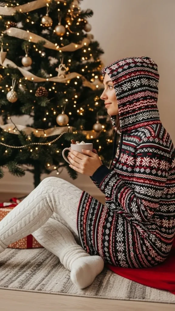 A soft hoodie with pajama pants is casual and perfect for home lounging. Pick fleece or cotton blends for warmth. Pair with fuzzy socks or slippers. DIY option: add holiday iron-on patches to plain hoodies. Great for relaxing, reading, or indoor games with family. Comfortable, practical, and budget-friendly.