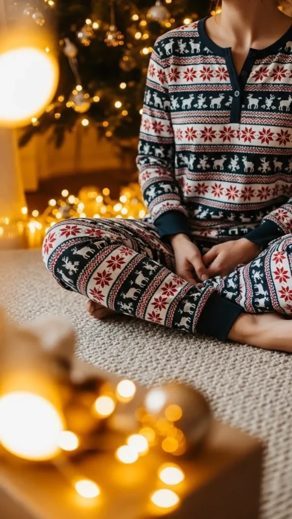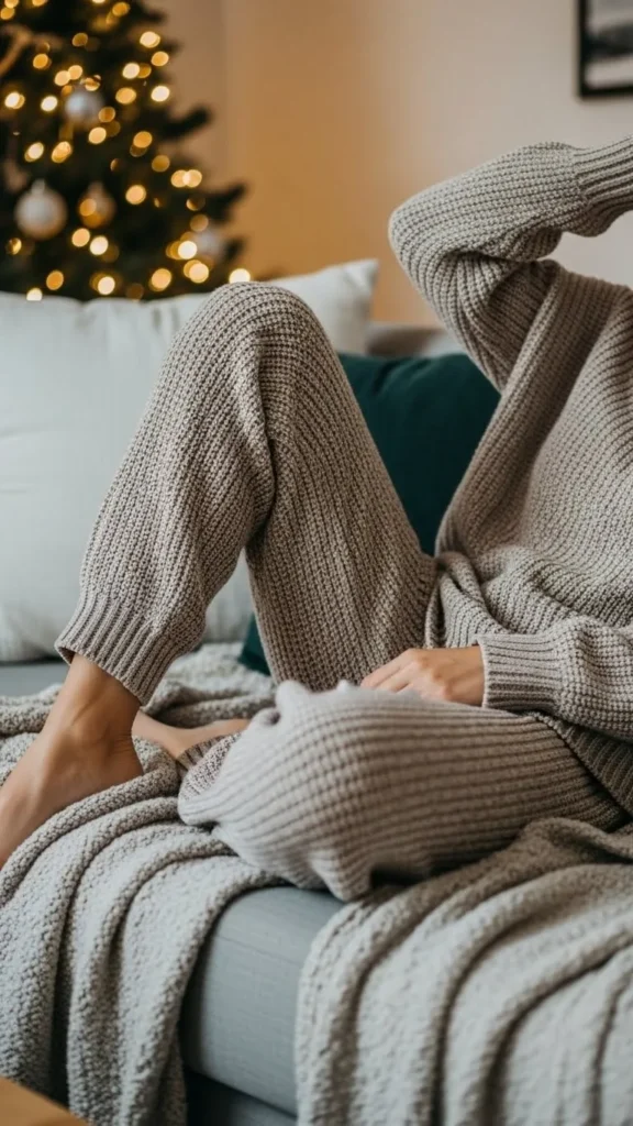 A knit sweater and pants set is soft, stretchy, and easy to move in. Choose neutral colors with subtle holiday patterns to mix comfort with style. Add warm socks and a knit headband for a polished lounge look. Budget stores often sell matching sets under $30. You can also make one with leftover yarn using simple knitting patterns for a personal DIY touch.