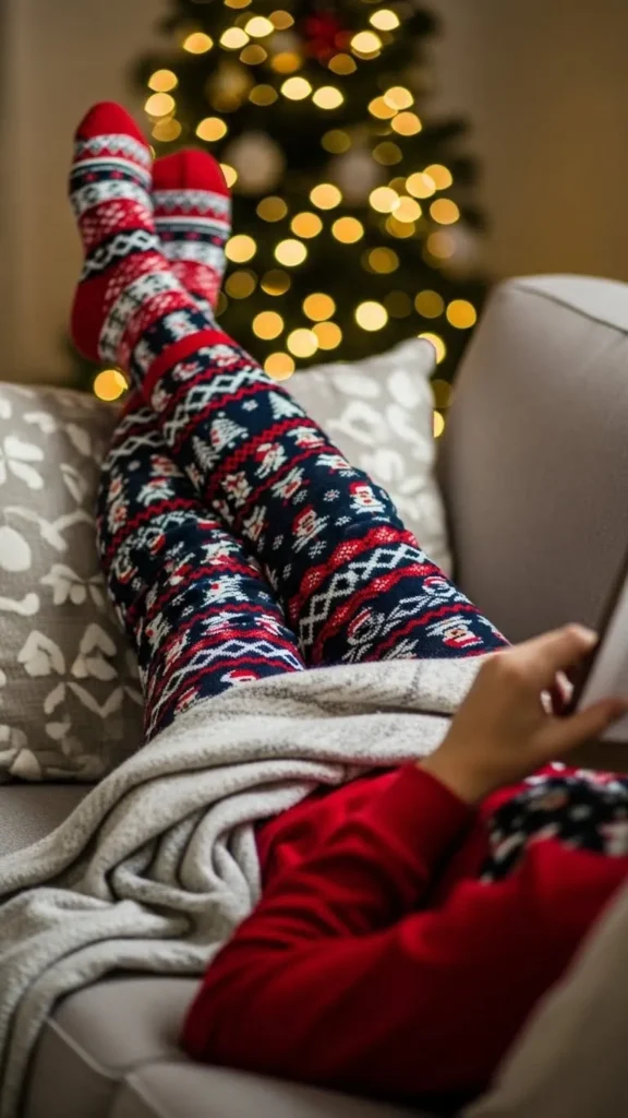 A pajama set with socks is simple and comfortable. Look for matching prints like candy canes or snowmen. Add soft socks to keep toes warm. You can DIY by sewing old t-shirts and pants together. Perfect for holiday mornings or cozy evenings. Inexpensive sets make it easy to switch colors and patterns for fun variety.