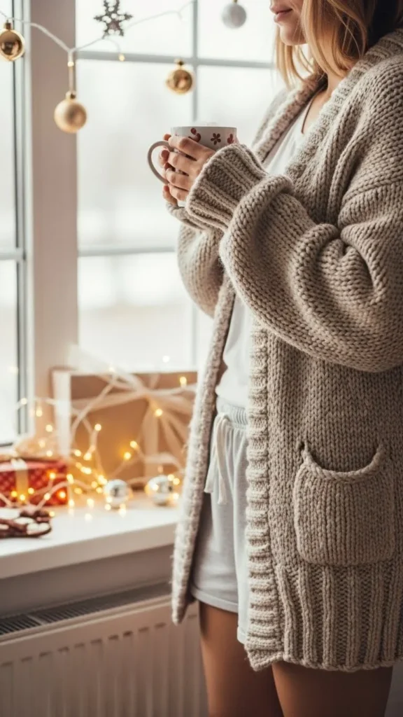 Pair a soft cardigan with lounge shorts for flexible warmth. Perfect for slightly chilly rooms. Add socks or slippers to keep feet cozy. You can DIY by layering old sweaters over shorts for a budget-friendly option. This outfit is perfect for casual indoor activities like crafting or gift wrapping.