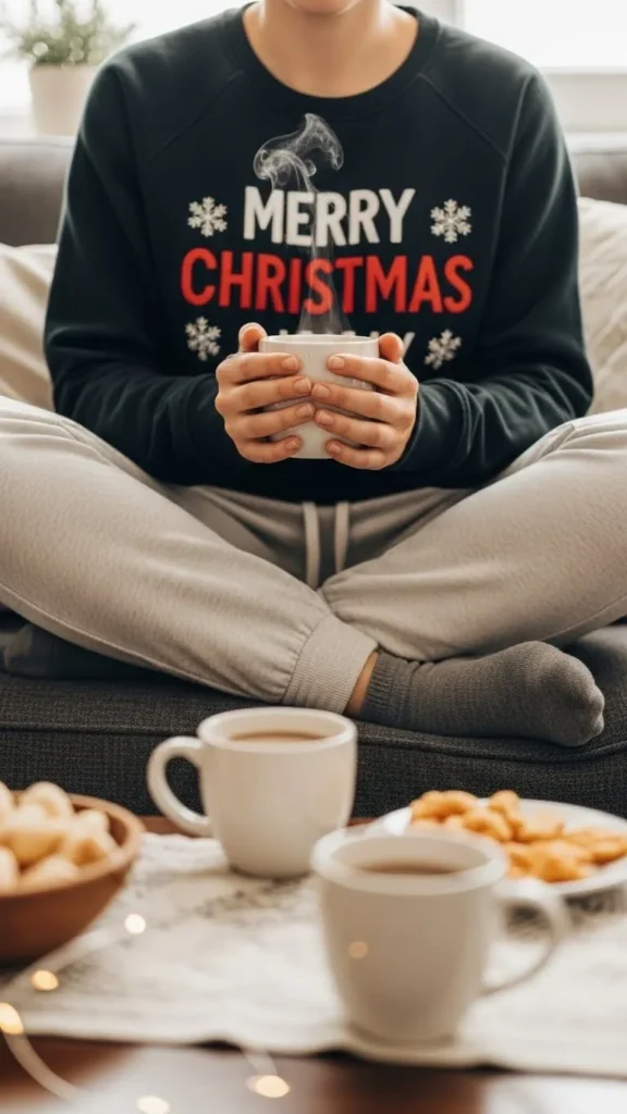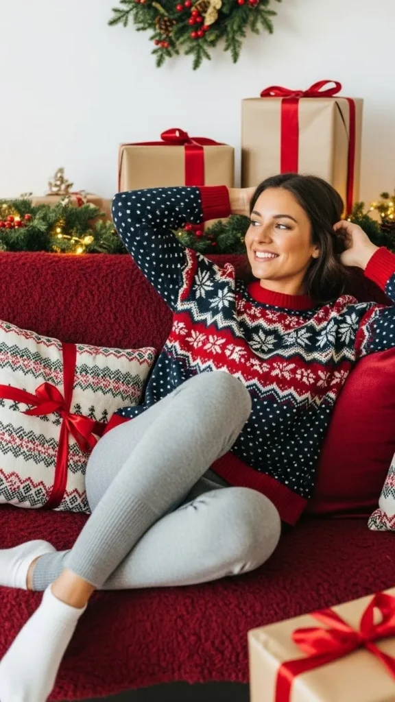 A knit pullover with lounge pants offers warmth and ease. Soft, flexible fabrics make it perfect for moving around the house. Add slippers for cozy toes. Budget-friendly DIY includes adding festive motifs to a plain pullover with fabric paint. Great for reading, wrapping gifts, or watching movies.
