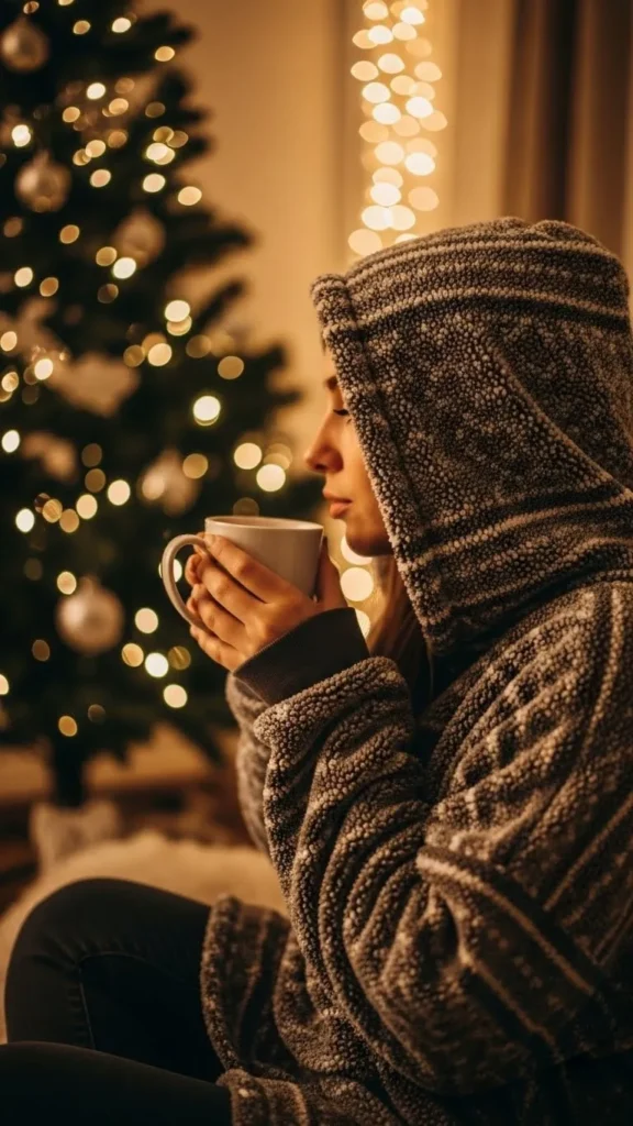 A fleece blanket hoodie doubles as a blanket and sweatshirt. It’s perfect for ultimate comfort and warmth. Ideal for reading, naps, or watching movies. Budget DIY: sew a plain fleece with a hood for a festive look. Pair with soft socks or slippers for a complete cozy outfit.