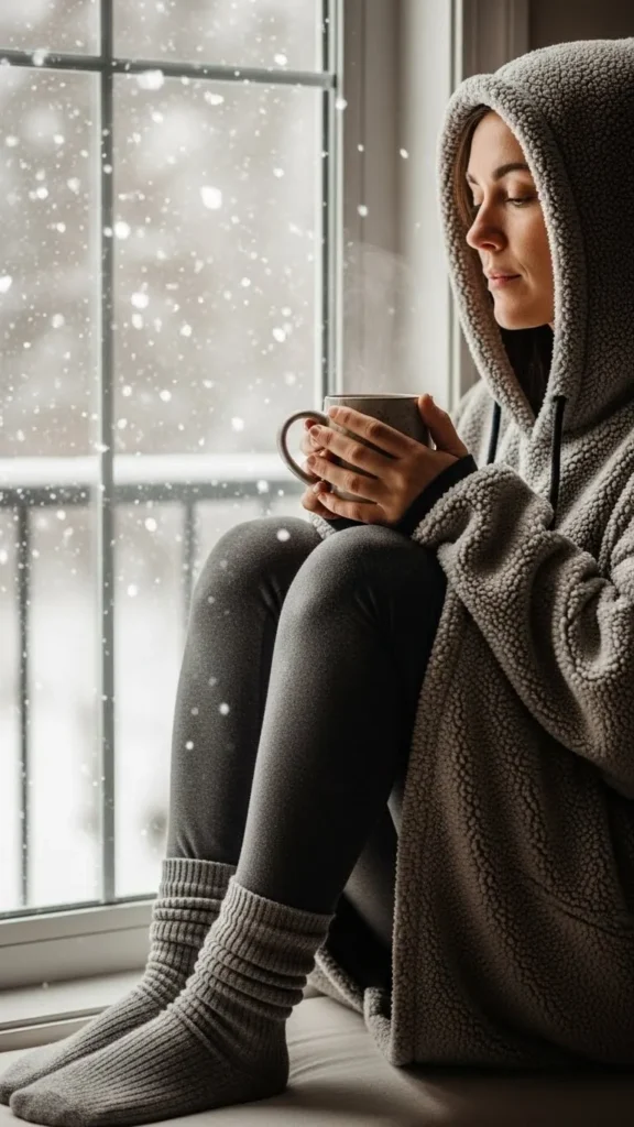 A chunky sweater with thermal leggings provides warmth and comfort. Pick soft, breathable materials for indoor use. Add slipper socks for extra snugness. You can even layer an old oversized sweater over leggings for a DIY outfit. Perfect for reading, gift wrapping, or casual home activities. Affordable and practical, it’s a simple solution for cold winter days.