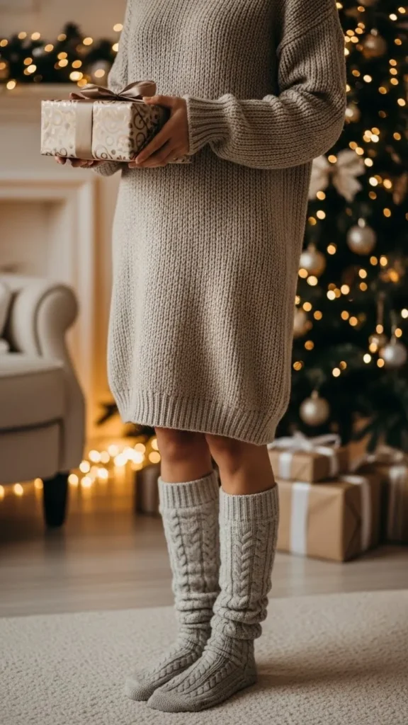 A knit lounge dress is comfortable and a bit dressy for home wear. Pair with leggings or thick tights to stay warm. You can add a DIY belt made from ribbon for a festive touch. Perfect for casual visits at home or holiday selfies. Affordable options can be found in discount stores or made from old sweaters.