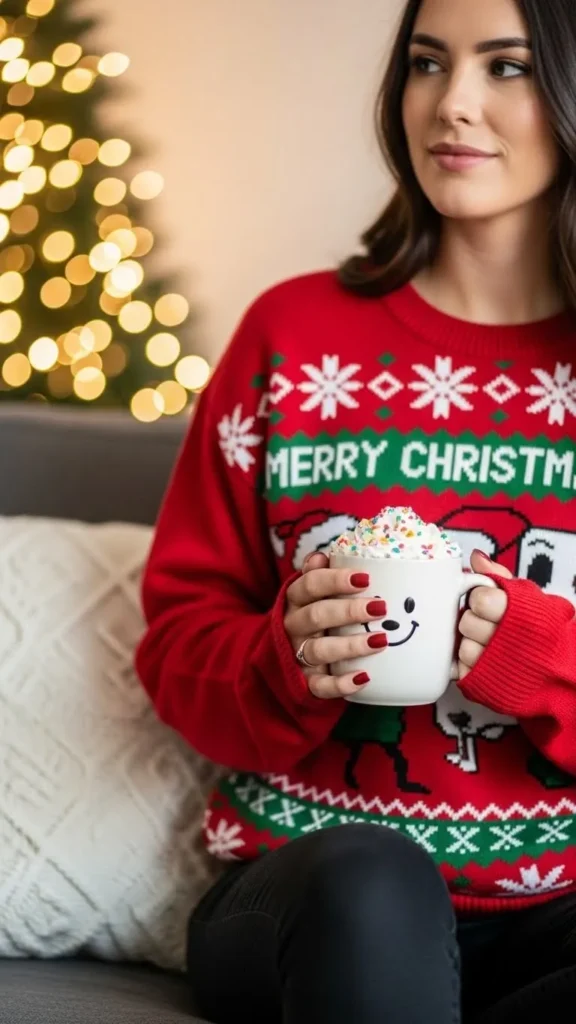A Christmas sweatshirt with joggers is perfect for ultimate comfort. Pick lightweight fleece or cotton blends. Roll up the joggers slightly to show off holiday socks. This outfit is perfect for movie nights or online family calls. DIY options include adding iron-on Christmas patches to plain sweatshirts to save money and add fun flair.