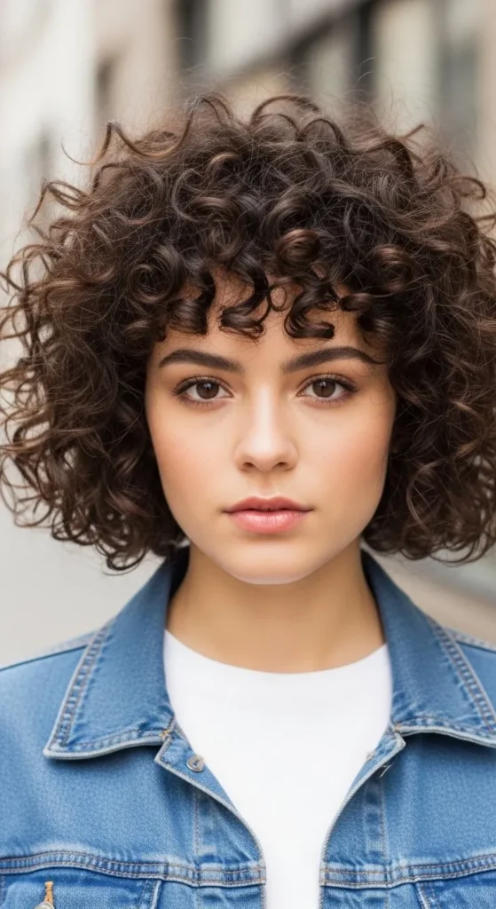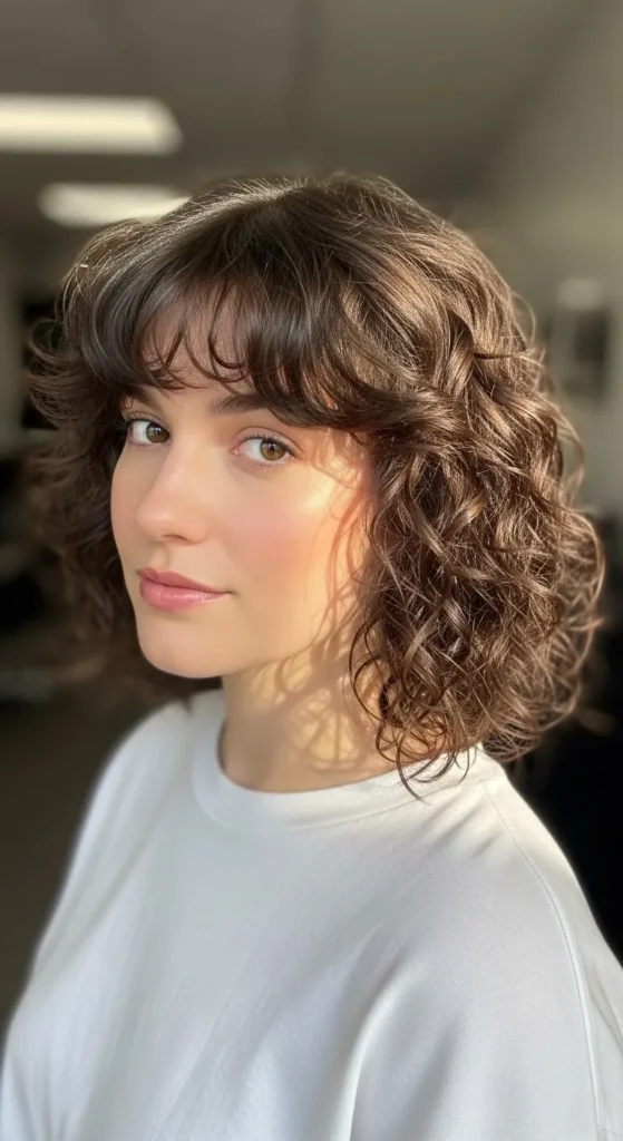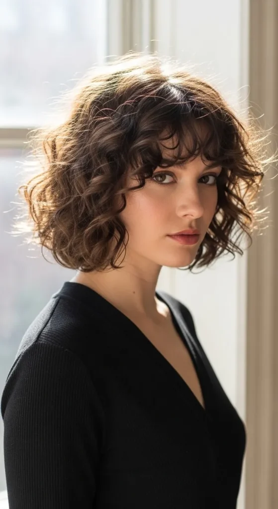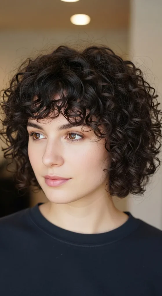 If they get too puffy, lightly mist with water and reshape. Curtain bangs grow out nicely, so you do not need constant trims. This style looks trendy but still simple. It works well for many face shapes because it adds balance. With minimal product and easy upkeep, this curly bob feels modern and practical.