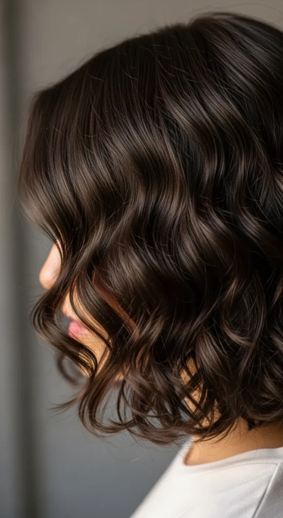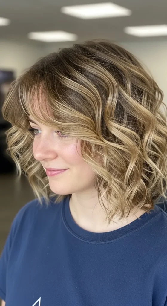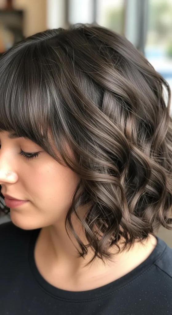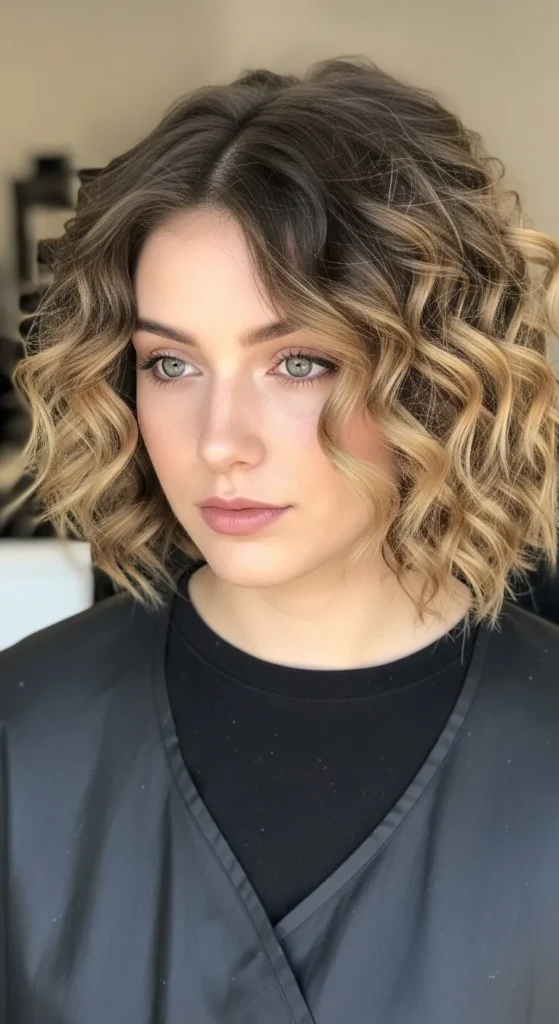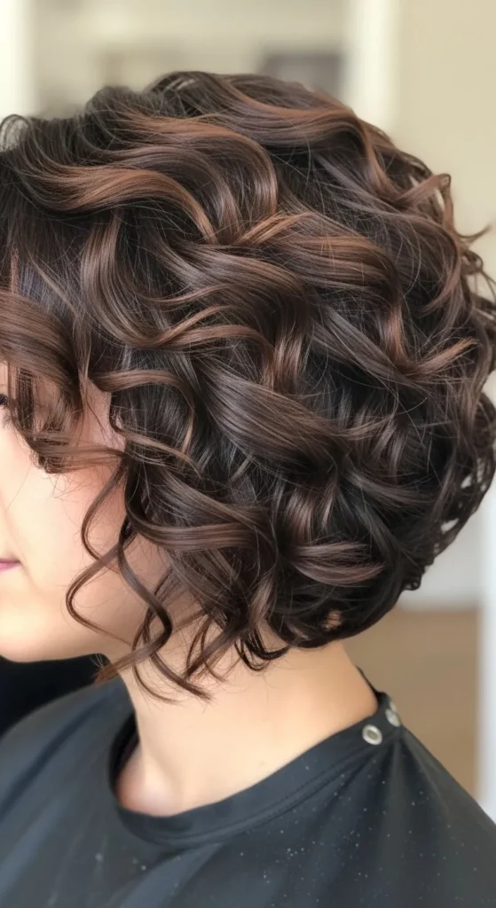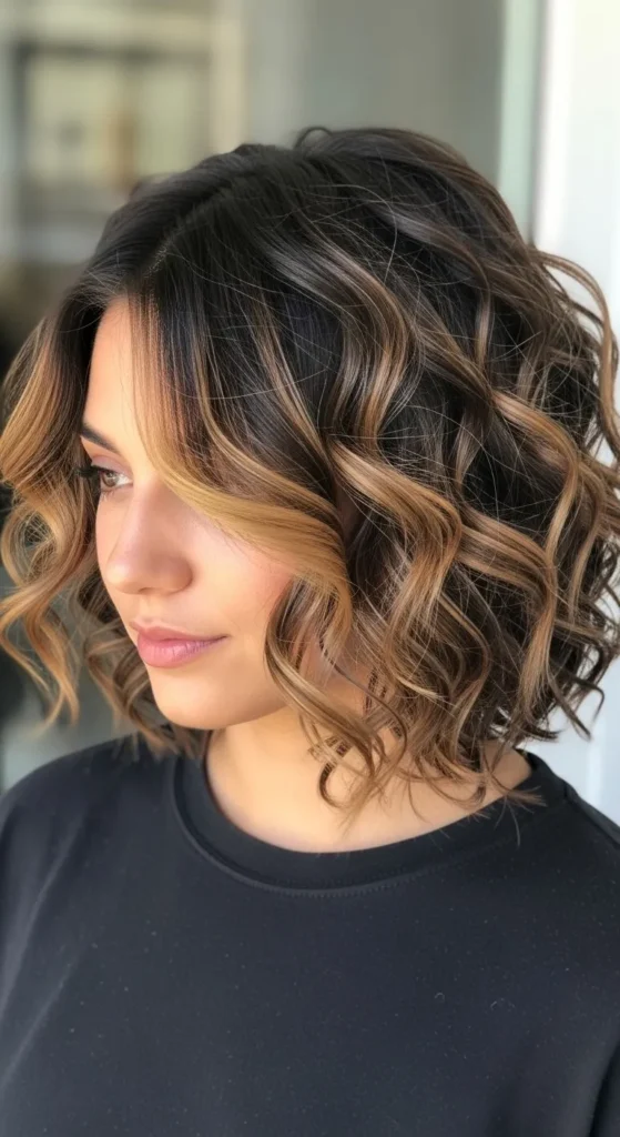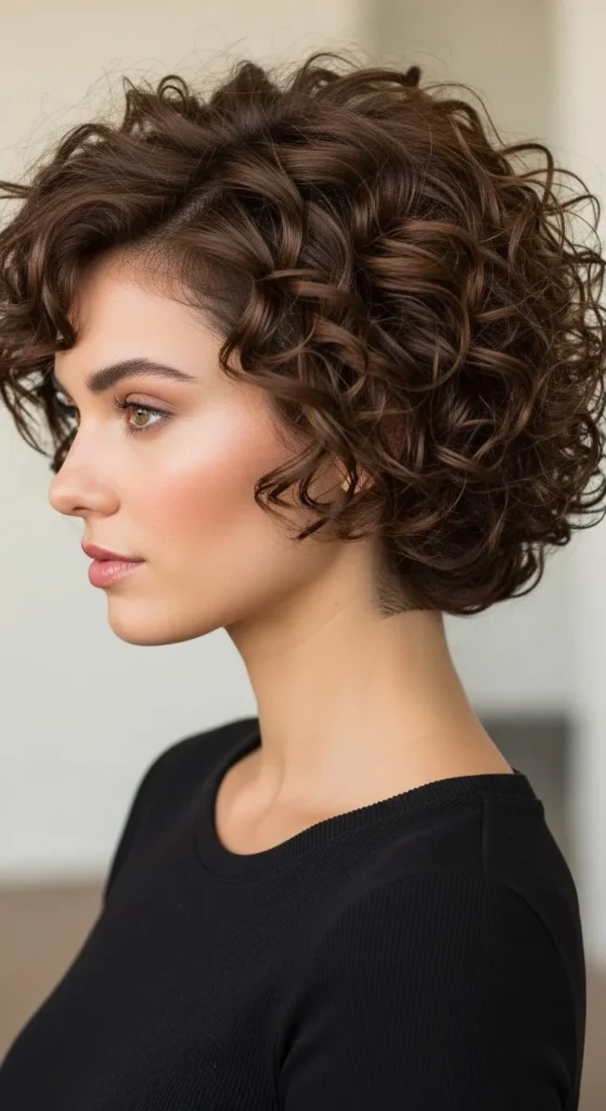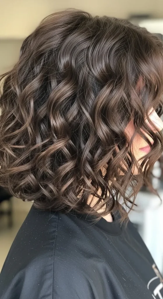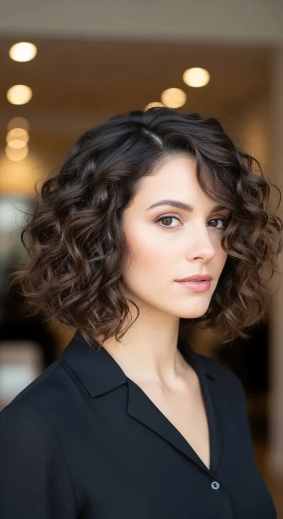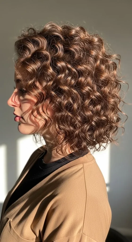 The asymmetrical curly bob feels bold yet wearable. One side is slightly longer, creating a modern shape. It adds personality without needing bright colors or heavy styling. Ask your stylist for a subtle length difference. Too dramatic can be hard to manage. Keep the shorter side above the chin and the longer side near the jaw.