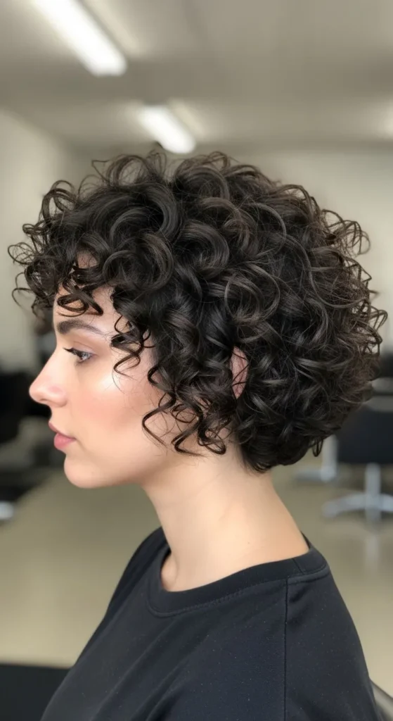 This short curly bob keeps the back slightly tapered and neat. The top stays full and curly. It is great if you like shorter hair but still want volume. Ask for gradual tapering at the nape. Avoid cutting the top too short. Style with mousse at the roots and curl cream on the ends. Diffuse gently while lifting the top for height. This cut dries quickly and uses less product. That saves time and money. It feels light and easy, especially in warm weather. Regular trims keep the tapered shape clean. It is simple, cute, and very manageable for everyday life.